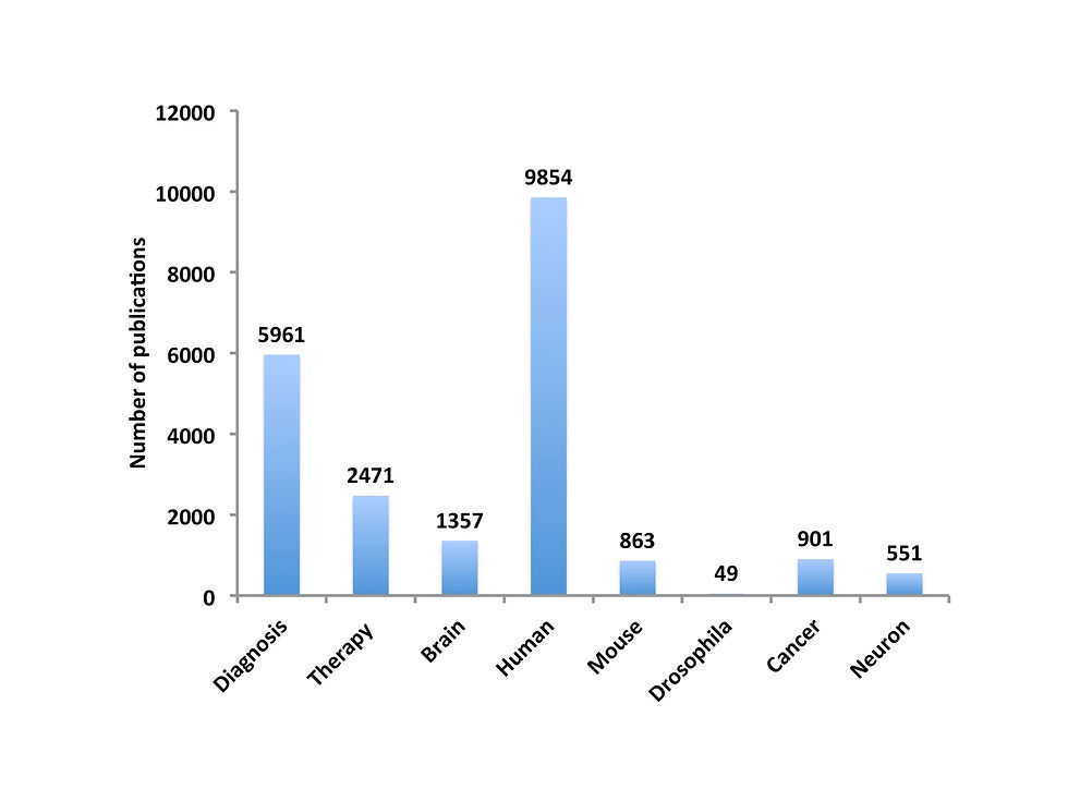 Since the discovery of trisomy 21 in 1950s, the research in DS has grown steadily as shown by the publications, 10899 in total (Figure 1). Among the hot topics are diagnosis, therapy, and brain (Figure 2), which are mostly done in human. The new frontiers developed along with the new techniques include epigenetics, chromatin, gene therapy, and circadian (Figure 1, 3, 4). Some field such as meiosis started early in 1970s but keeps quiet and didn't grow (Figure 1, 4), probably due to the difficulty to crack the quesion of HSA21 non-disjunction. As we see the data for different countries, no country can compete with USA, with the European countries in the 2nd group, except Japan maybe due to its high prevalance of DS. Most countries with high prevalence of DS seem to produce more publications than other countries (Figure 5). Compared to its population, the number from China is really not significant (Fig.5). With these data in mind, you can select a country to stay and a field to work in, so that you have a better chance to flourish in DS research.